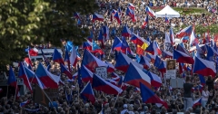 The protesters denounced NATO “warmongering,” as well as economic “disruption” and “energy and health restrictions,” linked to the sanctions the EU imposed on Russia over the conflict in Ukraine.